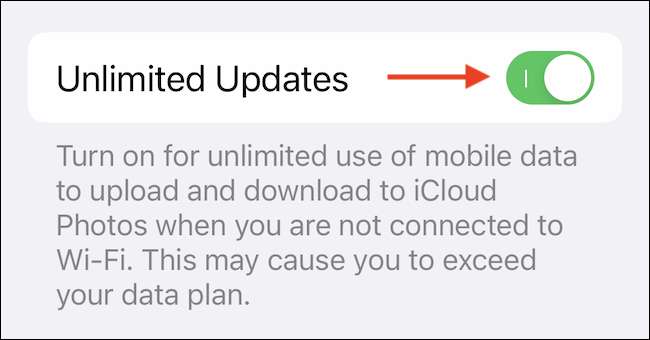 Por outro lado, se você tiver um plano de dados ilimitado, poderá ativar o recurso "Atualizações Ilimitadas". Ele usa dados celulares para carregar e baixar fotos do iCloud sem quaisquer restrições.