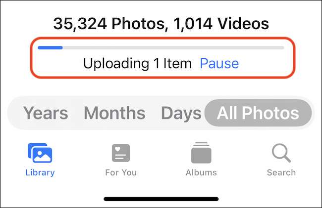 Agora que o recurso é configurado, qualquer nova foto ou vídeo será carregado para iCloud instantaneamente (junto com todas as suas fotos antigas e vídeos na biblioteca). Para verificar o progresso, abra o aplicativo Fotos e vá para a guia "Biblioteca" ou o álbum de fotos "Recententes". Na parte inferior, você verá a barra de progresso de upload.