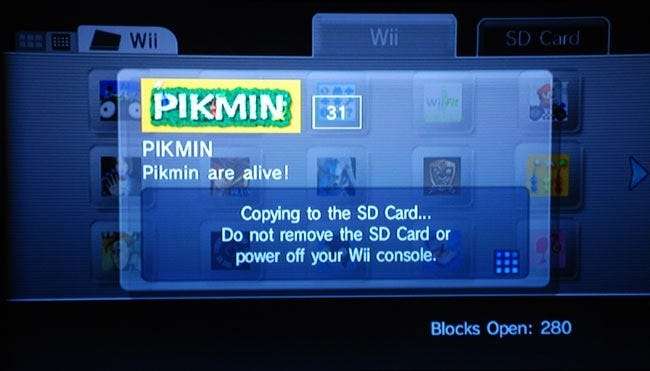 Vamos reverter o processo agora e colocar aquela cópia do jogo Pikmin salvo no Wii. Temos o backup salvo do jogo no diretório apropriado para o jogo, \ private \ wii \ title \ R9IE \ , e tudo o que precisamos fazer é colocar o cartão SD de volta no Wii e navegar até Opções Wii -> Gerenciamento de dados -> Salvar dados -> Cartão SD . Selecione o jogo salvo que deseja, clique cópia de , e você está no negócio: