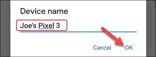 Por fim, digite o novo nome para o seu telefone Android ou tablet e toque em "OK" ou "Salvar".