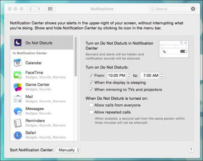 Vamos passar por essas configurações passo a passo e ver o que você pode fazer. De muitas maneiras, as configurações de notificação no OS X são muito como aqueles encontrados no iOS . O primeiro item é Não perturbe, que permite definir um horário e atribuir condições durante as quais seu computador irá ou não interromper ou perturbar.