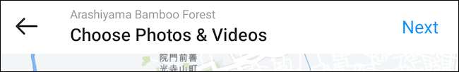 Quando você seleciona um local, Instagram irá pedir-lhe para escolher quais as imagens ou vídeos que pretende apresentar com ele. Toque no botão azul “Next” uma vez que você está feito.