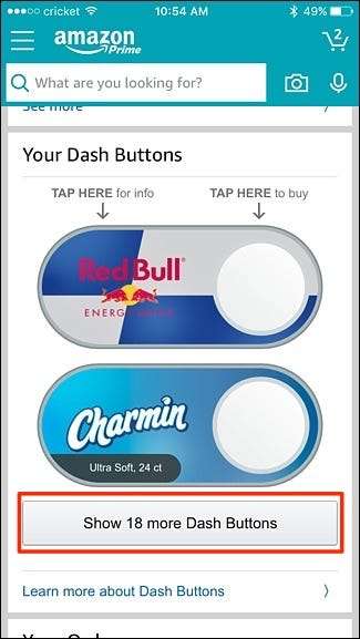 Comece abrindo o aplicativo Amazon em seu telefone e role para baixo até que a seção “Seus botões do painel” apareça. Toque em “Mostrar mais XX botões do painel”.