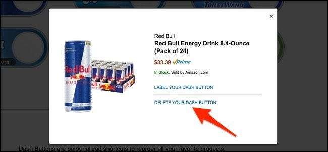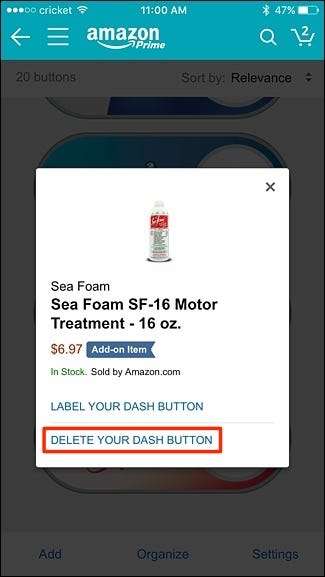 Primeiro, vamos excluir os botões virtuais do Dash criados automaticamente que não queremos. Para fazer isso, comece tocando no logotipo do produto e, em seguida, toque em “Delete Your Dash Button”.