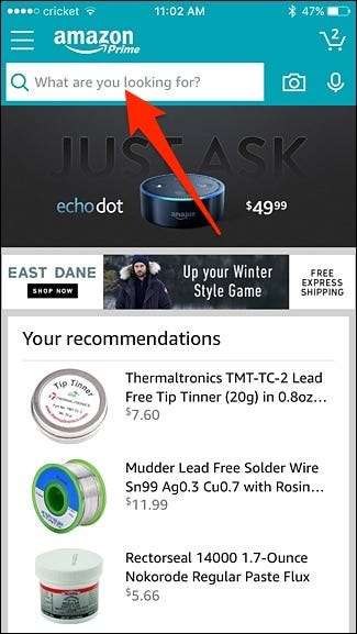 Depois disso, vamos criar um novo botão Dash virtual. Volte para a tela principal do aplicativo Amazon e toque em na barra de pesquisa na parte superior.