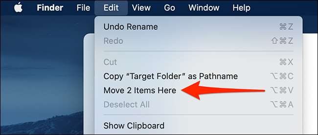 Navegue até a pasta onde você deseja colar os arquivos. Aqui, pressione e segure a tecla de opção e selecione Editar & GT; Mova os itens aqui da barra de menus do Finder.