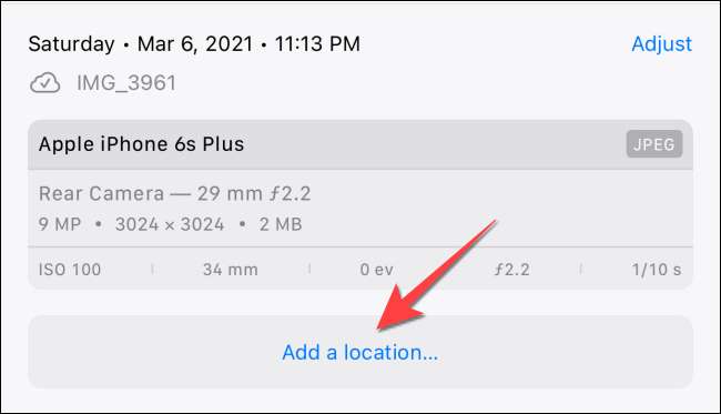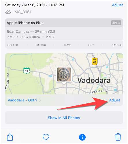 Sob as informações da foto, você virou a foto com a localização no mapa. De lá, toque no "ajuste" no canto inferior direito.