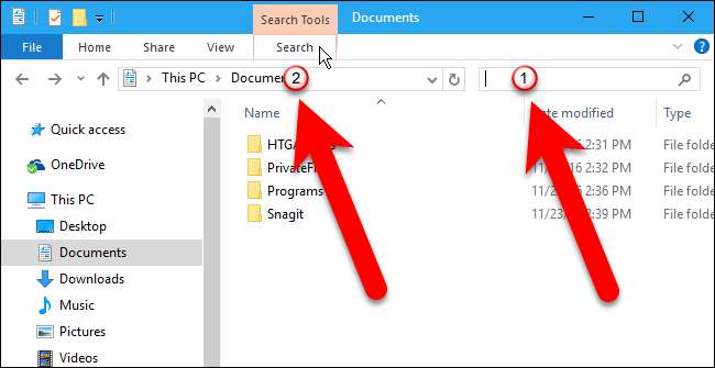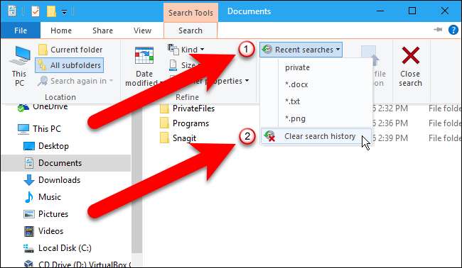 Para excluir facilmente todo o seu histórico de pesquisa no File Explorer do Windows 8 e 10, clique na caixa Pesquisar e, em seguida, clique na guia Pesquisar que se torna disponível.