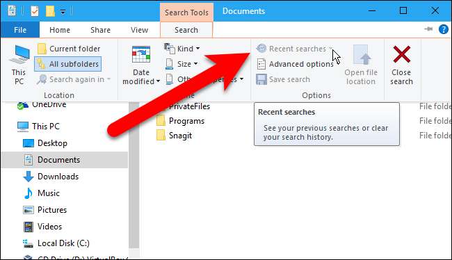 Todo o histórico de pesquisa do File Explorer é excluído e o botão Pesquisas recentes fica acinzentado, indicando que você não tem histórico de pesquisa. Observe que não há confirmação antes que o histórico seja excluído.