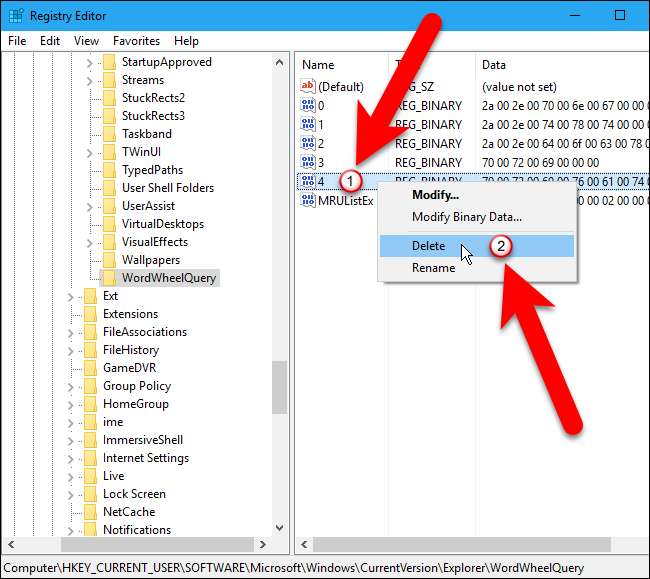No painel direito, você verá uma lista de valores numerados. Cada número é um termo que você pesquisou no File Explorer. Você não pode ver qual termo é qual até clicar duas vezes em um valor, então faça isso agora.