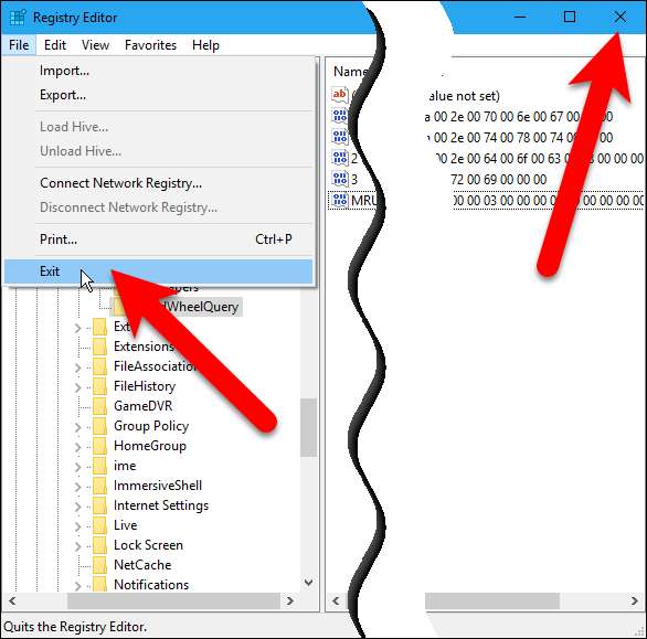 Feche o Editor do Registro acessando Arquivo> Sair ou clicando no “X” no canto superior direito da janela.