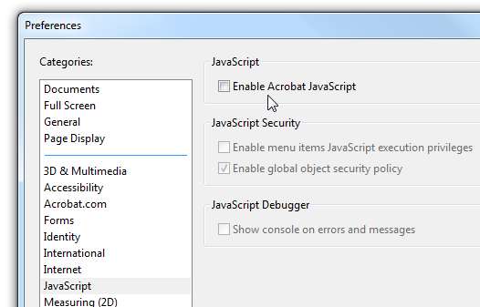 Também não há aplicativo antivírus verificando esta falha de segurança, então não pense que você está seguro ainda ... a falha mais recente requer a desativação do Javascript no Adobe Reader e, para fazer isso, você precisará acessar Editar -> Preferências e em seguida, localize a categoria JavaScript no lado esquerdo.
