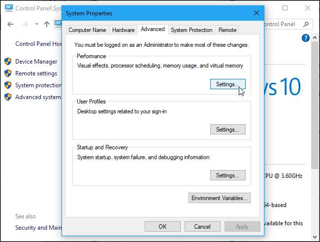 Clique na guia “Avançado” na janela Propriedades do sistema e clique no botão “Configurações” em Desempenho.