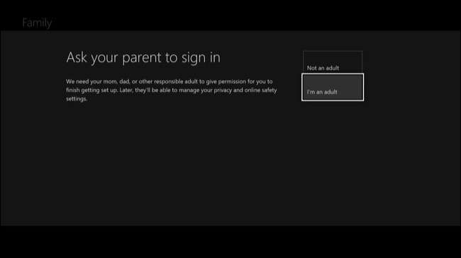 Você verá a tela “Peça aos seus pais para fazer login” se estiver fazendo login com uma conta de menor de idade. Selecione “Eu sou um adulto”. Você precisará selecionar sua conta principal e fornecer a senha para terminar de adicionar o usuário menor de idade.