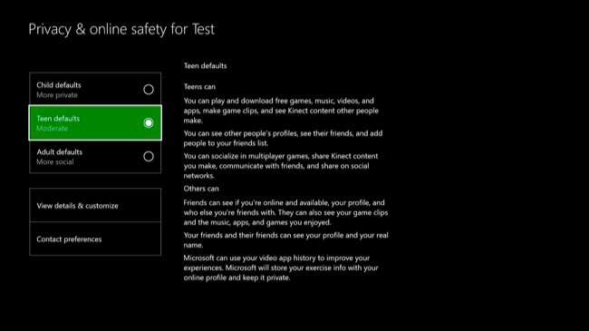 A tela “Privacidade e segurança online” permite que você personalize as configurações online e de privacidade. Você pode escolher “Padrões infantis”, “Padrões adolescentes” ou “Padrões adultos”. Você também pode selecionar “Exibir detalhes e personalizar” para ajustar as configurações com mais detalhes.