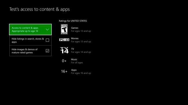 A tela “Acesso ao conteúdo” permite que você controle quais jogos, mídia e aplicativos uma conta pode jogar. Isso usa as classificações de jogo, filme, TV, música e app. Você também pode ocultar imagens e demos de jogos para adultos na loja e evitar que apareçam quando a conta do usuário faz pesquisas.
