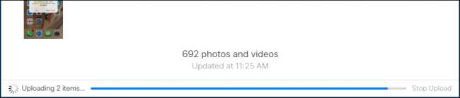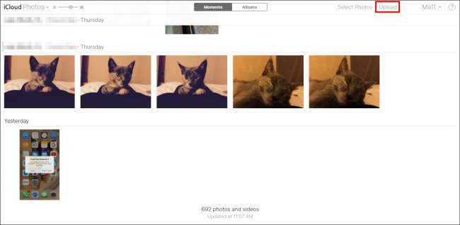 Em seguida, clique no botão “Upload” no canto superior direito da janela Fotos.