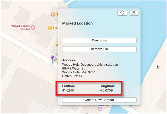 Na bolha de "localização marcada", que aparece, você encontrará a latitude e a longitude desse local logo abaixo do endereço.
