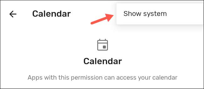 Por padrão, o Android não exibe aplicativos no nível do sistema nesta ferramenta. Para incluí-los como o resto dos aplicativos de terceiros, toque no ícone de menu de três pontos dentro de uma lista de permissão e selecione o botão "Mostrar sistema".