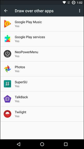A lista na captura de tela acima mostra todos os aplicativos que têm permissão para desenhar na tela, mas se você puder descobrir qual deles está realmente desenhando na tela quando receber esse erro, você pode simplesmente desabilitar aquele e seguir em frente.