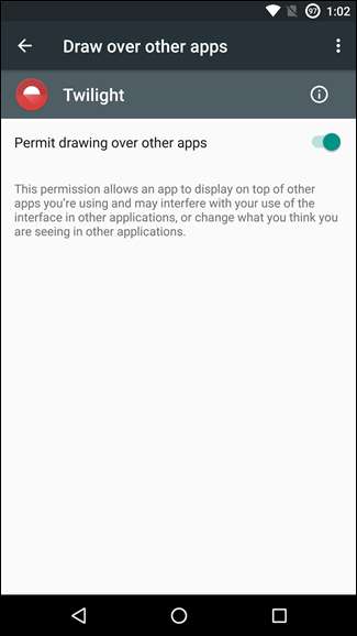 Portanto, se você instalar um novo aplicativo e iniciá-lo pela primeira vez ao mesmo tempo em que conversa por meio de um chat no Facebook, receberá um erro quando o novo aplicativo tentar solicitar suas permissões. No exemplo abaixo, estou usando Crepúsculo - um aplicativo de “modo noturno” - que usa uma sobreposição de tela para fazer seu trabalho.