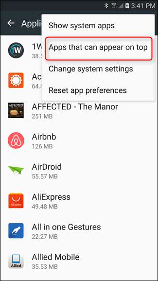 Felizmente, é uma correção muito fácil quando você sabe o que está causando o erro: um recurso encontrado no Marshmallow e além que permite que os aplicativos "se sobreponham" a outros aplicativos. Por exemplo, o Facebook Messenger usa cabeças de bate-papo para ficar em primeiro plano em tudo o que você está fazendo - este é o aplicativo que usa o recurso “Desenhar sobre outros aplicativos”. Em outras palavras, é uma sobreposição de tela. Já está começando a clicar, não é?