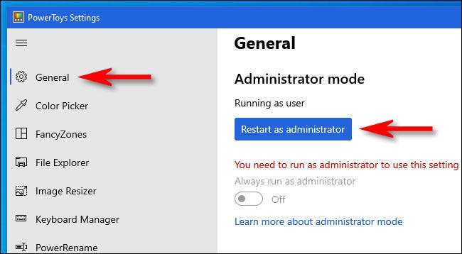 Mas, se você gostaria de desativar as miniaturas do SVG mais tarde (sem desinstalar o PowerToys) ou você já desativou e deseja ativá-los, inicie "Configurações do PowerToys". Clique em "Geral" na barra lateral e, em seguida, clique em "Reiniciar como administrador".