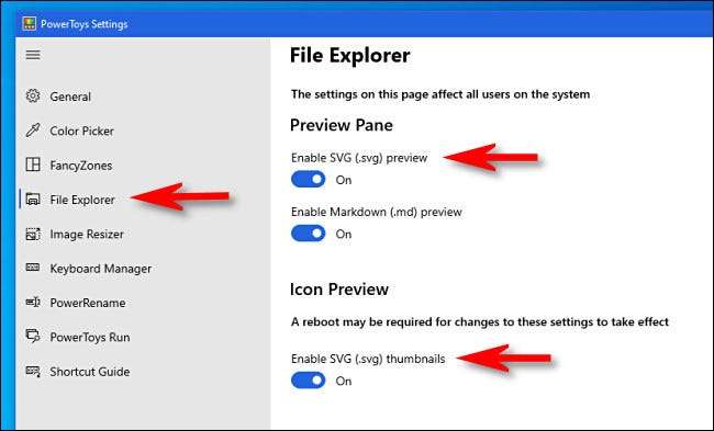 Quando "PowerToys Settings" recarrega (você pode achar minimizado na bandeja do sistema), clique em "File Explorer" na barra lateral e verá as opções relacionadas a ativar ou desativar as miniaturas do SVG. Clique nas opções que você deseja alterar.