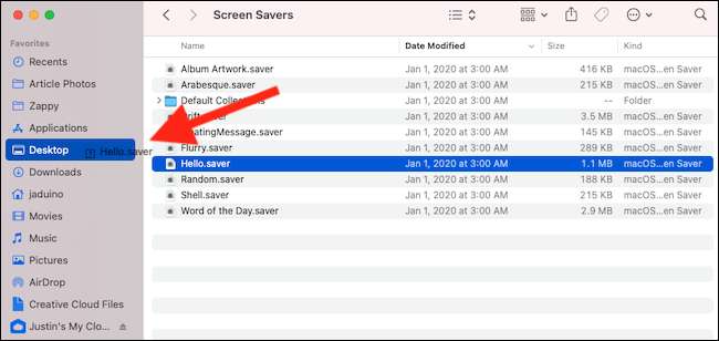 Agora você estará no menu de proteção de tela do seu Mac. Contanto que você esteja executando MacOS Big Sur 11.3 ou mais, você encontrará "Hello.Saver" na lista de opções. Arraste o arquivo para a sua área de trabalho.