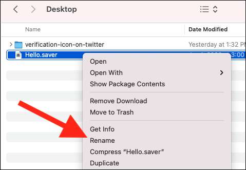 Antes de adicionar o protetor de tela ao seu Mac, você precisa renomear o arquivo. Para fazer isso, clique com o botão direito do mouse no arquivo e escolha a opção "Renomear". Nós mudamos o nome para