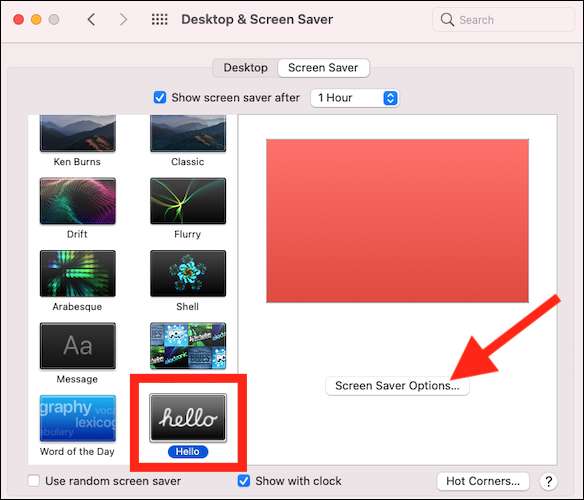Selecione e realça a opção "Hello" na lista para torná-lo a proteção de tela padrão do Mac. Você também pode clicar no botão "Screen Saver Options" para personalizar sua aparência.