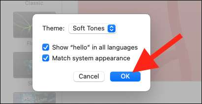 Na janela pop-up, você pode trocar entre três temas diferentes (tons moles, espectro, mínimo ou uma combinação de todos os três), optar por ter a frase "hello" soletrada em vários idiomas e corresponder ao protetor de tela para A aparência do sistema do seu Mac.