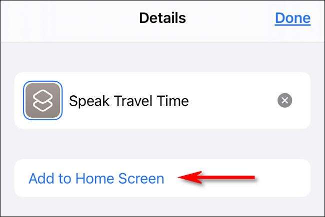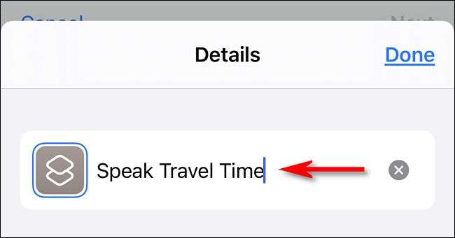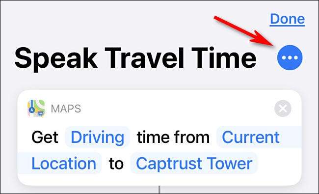 Na página "Novo atalho", toque no botão de elipses (três pontos em um círculo) e, em seguida, toque no campo "Nome de atalho" e insira um novo nome que você deseja. Nós escolhemos "falar tempo de viagem", mas você pode nomear tudo o que quiser. Em seguida, toque em "Concluído".