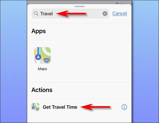 De volta à tela principal de edição de atalhos, toque no botão "Adicionar ação". No painel que aparece, procure por "viajar", depois toque em "Obter tempo de viagem".