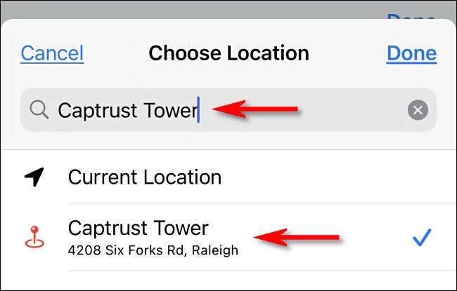 Obviamente, sua localização final varia de acordo com se você está calculando o tempo de viagem de casa para trabalhar ou do trabalho para casa. Nesse caso, vamos assumir que você está começando em casa (então vamos deixar "Localização atual" definida) e definir um destino personalizado tocando "Localização final".