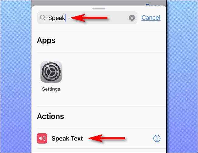 De volta à tela de edição de atalhos, toque no botão Circular Plus ("+") para adicionar outra ação. No painel que aparece, procure por "falar", em seguida, selecione "Falar texto" dos resultados.