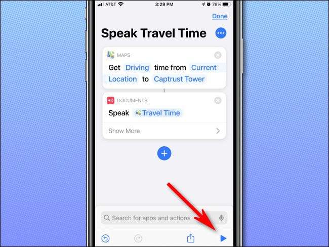 Quando você pressiona esse botão de reprodução, o atalho será executado, e você deve ouvir Siri falar um tempo alto, como "10 minutos" ou "2 horas". O tempo varia de acordo com as condições de tráfego ao vivo calculadas a partir do aplicativo Apple Maps.