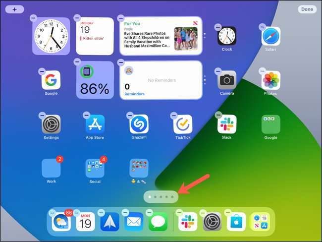 Toque e segure em qualquer lugar na tela para entrar no modo de edição. Você vai ver o seu ícones de aplicativos jiggle. Em seguida, toque no controle deslizante da tela na parte inferior, logo acima da sua Dock.