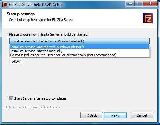 Depois de baixar o programa, você pode instalá-lo com todas as configurações padrão. O FileZilla instalará um serviço que é executado sempre que o Windows é inicializado, portanto, se você preferir apenas executar o servidor FTP manualmente, selecione a opção apropriada no menu suspenso na terceira tela: