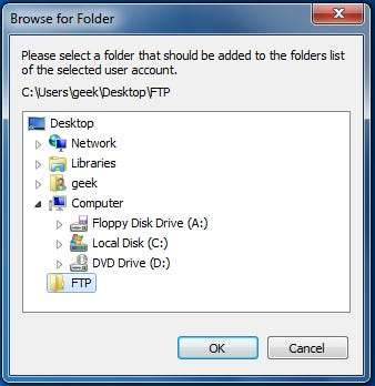 Clique em OK quando terminar de inserir o nome da conta e clique em “Adicionar” na seção “Pastas compartilhadas”. Depois de fazer isso, uma janela como a abaixo aparecerá, use-a para selecionar o diretório que deseja compartilhar como um repositório FTP.