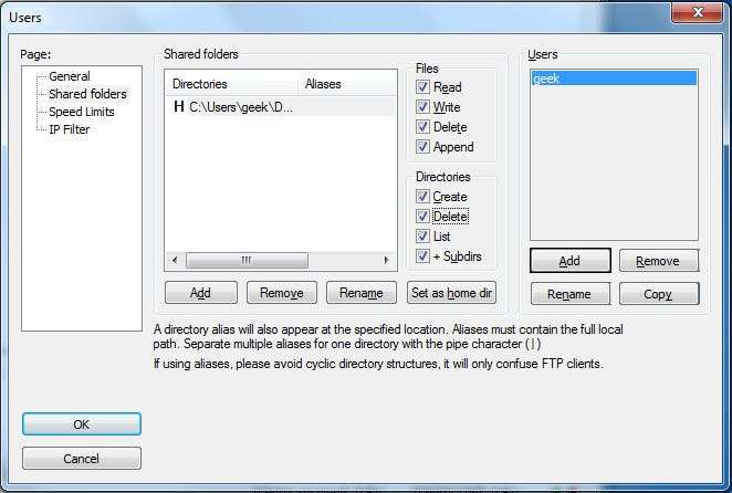 Assim que a interface do servidor FTP for carregada, estamos prontos para especificar um diretório como repositório FTP. Se o diretório que você deseja usar ainda não foi criado, minimize a interface e crie uma pasta onde deseja que o compartilhamento de FTP esteja. Neste tutorial, vamos usar a pasta ‘FTP’ em nosso desktop. Sua localização exata será “C: \ Users \ geek \ Desktop \ FTP”.