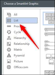 A janela "Escolher uma gráfica do SmartArt" aparecerá. No painel à esquerda, escolha uma opção que fornece um tipo de gráfico smartart que você pode digitar texto dentro. Nós usaremos "lista" neste exemplo.