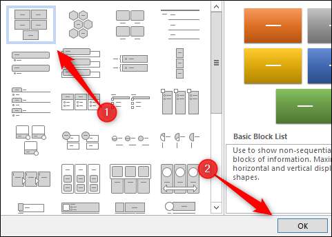 Em seguida, escolha o gráfico SmartArt que você gostaria de usar nas opções disponíveis na guia selecionada. Nós usaremos o gráfico smartt "básico da lista de blocos". Depois de ser selecionado, clique em "OK".
