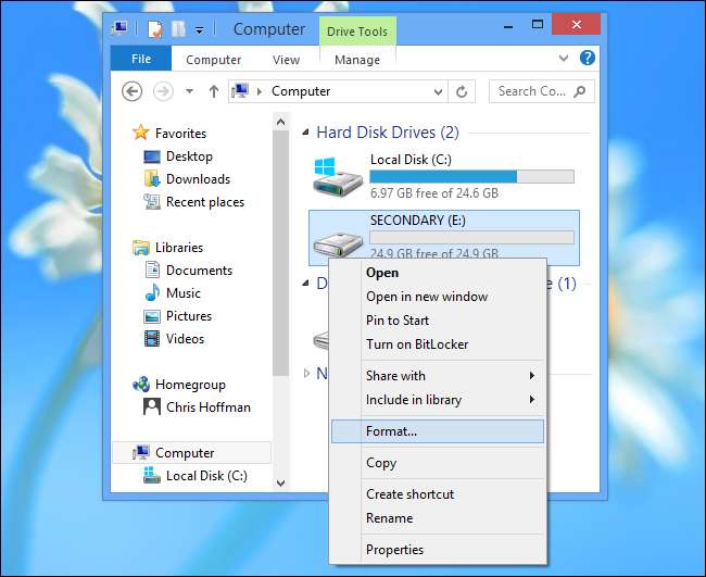 Faça backup de todos os dados importantes da unidade antes de continuar - a formatação excluirá todos os dados da unidade. Clique com o botão direito na unidade e selecione Formatar.