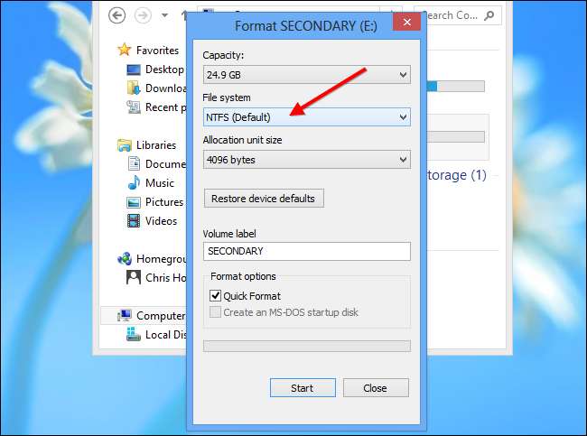 Escolha o sistema de arquivos NTFS e clique em Iniciar.