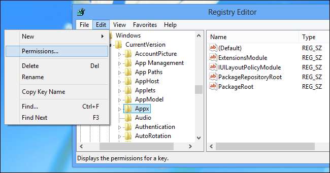 Selecione a chave Appx, clique em Editar e em Permissões. (Certifique-se de que a chave Appx esteja selecionada ou você modificará as permissões para outra chave!)