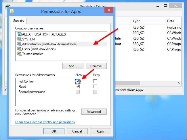 Selecione Administradores na janela Permissões para AppX e clique no botão Permitir opção ao lado de Controle total. Clique em OK e agora você poderá editar a configuração de registro apropriada.