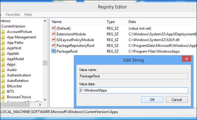 Clique duas vezes no valor PackageRoot no painel direito e insira o local da pasta que você criou anteriormente. Isso é E: \ Windows8Apps \ no caso do nosso exemplo.