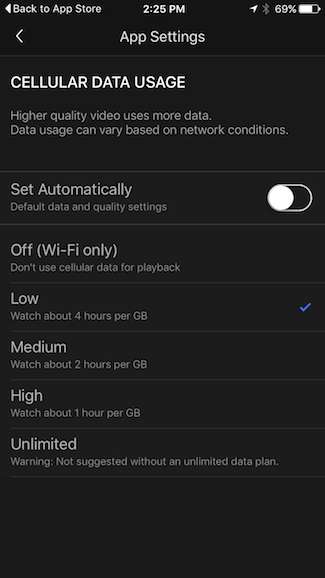 - Desligado (apenas Wi-Fi) : Você só poderá assistir ao conteúdo por Wi-Fi. Se você estiver conectado a uma conexão de dados móveis, não será possível visualizar o conteúdo.