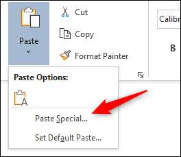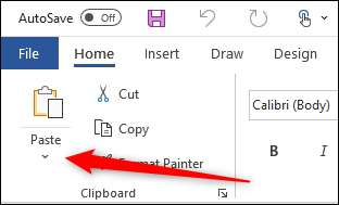 Agora, Abra o documento da palavra Você gostaria de vincular ou incorporar o slide para. No grupo "Prancheta" da guia "Home", clique na seta para baixo em "Colar".